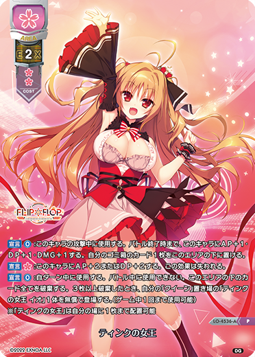 [宣言] [0]:自ターン中に使用する。バトル中に使用できない。このエリアの下のカード全てを破棄する。3枚以上破棄したとき、自分の「クイーン」置き場の「ティンクの女王 イオ」1体を無償で登場する。(ゲーム中1回まで使用可能)