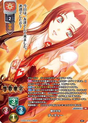 [宣言] [0]:対応・バトル中を除く自ターン中に使用する。このキャラを破棄する。自分にシールド+1できる。