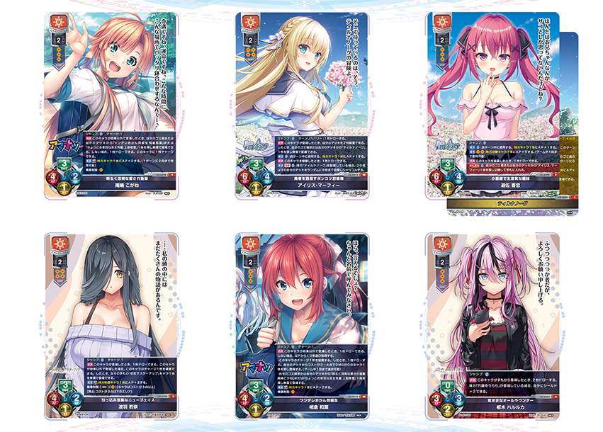 《引っ込み思案なニューフェイス 波羽 若奈》《現実主義なイラストレーター 九 恋乃香》《楽しさ最優先の親友 万願寺 うらら》はいずれも似た能力を持っていて、登場時に1枚ドローしつつ手札から『初恋マスターアップ』キャラを無償で登場できます。