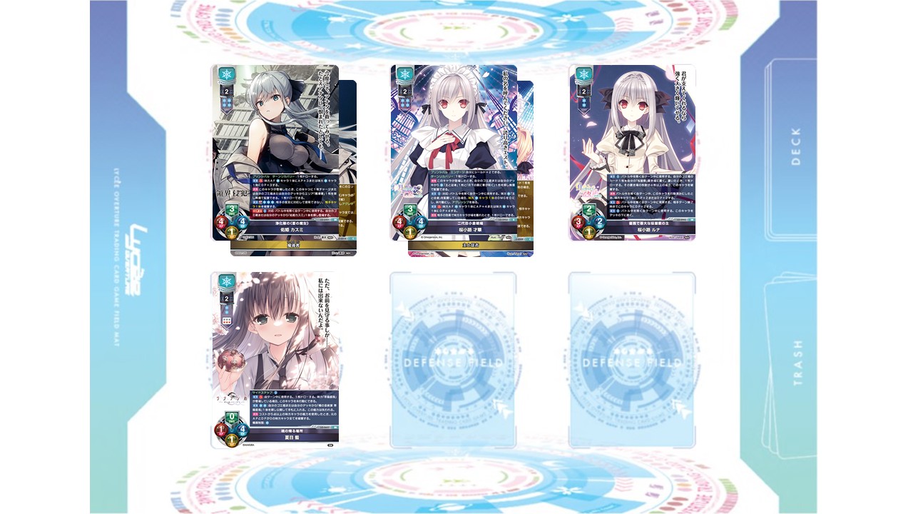 引き直しの基準は、《魔導書》を配置できる《浄化隊の《蒼の魔女》 佑姫 カスミ》と《主と従者》を配置できる《誇り高き完璧&残念お嬢様 エスト・ギャラッハ・アーノッツ》や《二代目小倉朝陽 桜小路 才華》です。さらに《優雅で尊大な桜屋敷の主 桜小路 ルナ》や《魂の帰る場所 夏目 藍》や《白髪に執着する天才若手女優 八日堂 朔莉》といったドロー能力を持つキャラが2体ほど登場できるようにしておきましょう!