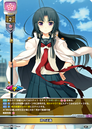 | [チャージ:2][エンゲージ:自分にシールド+1できる。] [コンバート:[花花花]:→「悪魔の力 沖姫々」] [誘発] このキャラが登場したとき、味方キャラが5体以下で味方「沖の正義」を配置していない場合、自分の手札を1枚破棄する。しない場合、自分のデッキを3枚破棄する。 [誘発] 自ターン終了時、このキャラのチャージ1枚を破棄できる。したとき、1枚ドローする。 [宣言] [0]:バトル中を除く自ターン中に使用する。自分の手札を1枚またはこのキャラのチャージ2枚を破棄する。したとき、自分のゴミ箱または自分のデッキから「沖の正義」1枚を探し無償で配置する。 |