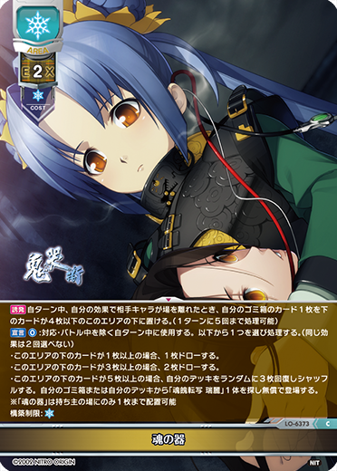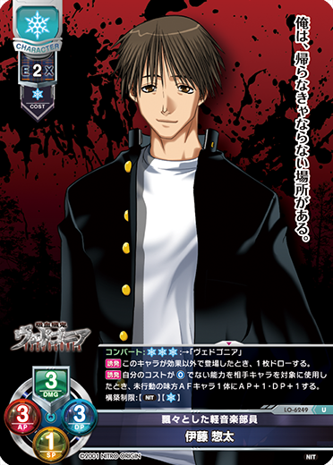| [チャージ:1] [誘発] このキャラが効果以外で登場したとき、1枚ドローする。 [誘発] 自分のコストが[0]でない能力を相手キャラを対象に使用したとき、未行動の味方AFキャラ1体にAP+2またはDP+2する。 [宣言] [C1]:対応・バトル中を除く自ターン中に使用する。{相手キャラ1体}に次の相手ターン終了時までAP-4・DP-4・DMG-4できる。自分の手札を2枚破棄できる。したとき、そのキャラを破棄する。 [誘発] このキャラが効果で場を離れたとき、自分のゴミ箱または自分のデッキから「飄々とした軽音楽部員 伊藤惣太」1体を探し無償で登場できる。 構築制限:【[NIT]】【[雪]】 |