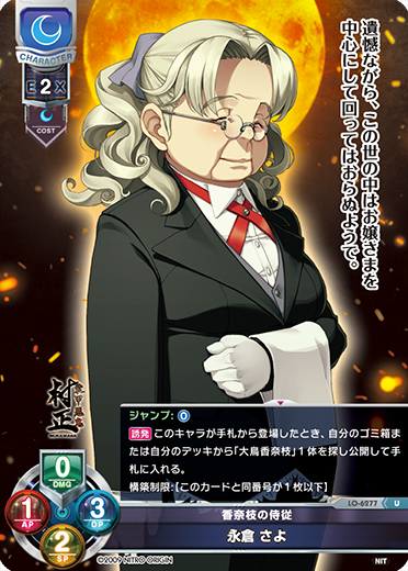 | [リーダー][プリンシパル][ジャンプ:[0]][ペナルティ:[ゴミ箱のこのキャラを除外する。]] [誘発] このキャラが登場したとき、自分のゴミ箱または自分のデッキから「善悪相殺の掟 湊斗景明」2体を探しカードが0枚の自分の「善悪相殺」置き場に置ける。置いたとき、自分のゴミ箱または自分のデッキから「善悪相殺」1枚を探し無償で配置する。1枚ドローまたは自分のゴミ箱または自分のデッキから「善悪相殺の掟 湊斗景明」1体を探し登場できる。1枚ドローする。 構築制限:『装甲悪鬼村正』 |