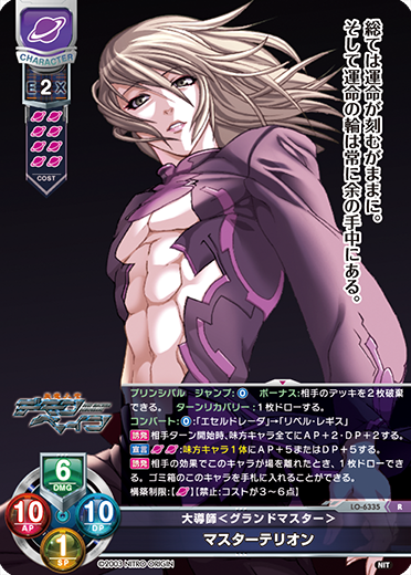 | [ジャンプ:[0]] [誘発] 相手ターン開始時、味方キャラ全てにAP+1・DP+1する。 [誘発] 相手がコストが1点以上の能力を使用したとき、味方キャラ1体にAP+1またはDP+1する。自分にシールド+1できる。(1ターンに3回まで処理可能) [宣言] [C1]:{コストが2点以下の味方防御キャラ1体}にAP+2・DP+2する。 [誘発] このキャラが相手の効果で場を離れたとき、1枚ドローできる。 ※このキャラは[コンバート]以外で登場できない。 構築制限:【[宙]】【禁止:コストが3~6点】 |