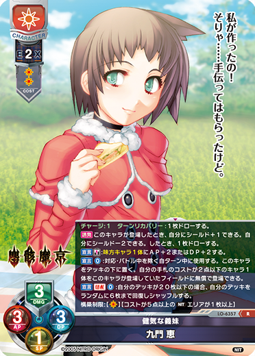 | [チャージ:1][コンバート:[日日日]:→「最も古い祈り」] [誘発] このキャラが登場したとき、自分にシールド+1できる。自分にシールドー2できる。したとき、1枚ドローする。 [宣言] [C1]:{味方キャラ1体}にAP+2またはDP+2する。 [誘発] 相手がコストが1点以上の能力を使用したとき、味方キャラ1体にAP+1またはDP+1する。自分にシールド+1できる。(1ターンに3回まで処理可能) [宣言][切札] [0]:自分のデッキが20枚以下の場合、自分のデッキをランダムに6枚まで回復しシャッフルする。 構築制限:【[日]】【コストが5点以上の[NIT]エリアが1枚以上】 |