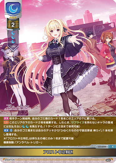| [チャージ:2] [宣言] [0]:{相手キャラ1体}にAP-1またはDP-1する。 [宣言] [0]:自ターン中に使用する。このターン中に登場していないこのキャラに1枚チャージできる。このキャラのチャージ2枚を破棄できる。したとき、1枚ドローする。 [宣言] [月]:対応・バトル中を除く自ターン中に使用する。自分のゴミ箱または自分のデッキから「秘めた牙」1枚を探しこのキャラに無償で装備する。この能力は失われる。 [手札宣言] [D1]:対応・バトル中を除く自ターン中に使用する。味方[月]キャラが2体以上の場合、ゴミ箱のこのキャラを元の[チャージ]1つを失い無償で味方DFに登場する。 |