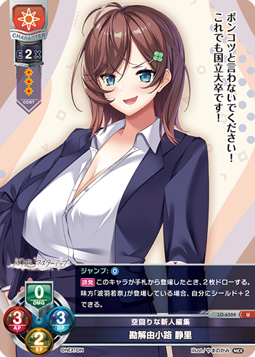 [誘発] このキャラが手札から登場したとき、2枚ドローする。味方「波羽若奈」が登場している場合、自分にシールド+2できる。