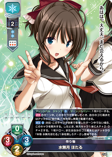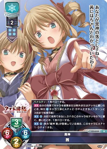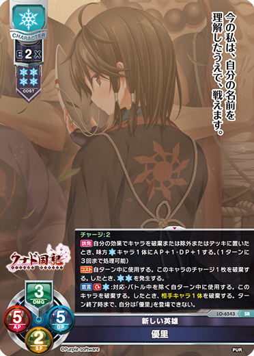 | [プリンシパル][ジャンプ:[0]][ターンリカバリー:[1枚ドローする。]] [誘発] 自ターン中、このキャラが登場したとき、自分のデッキを4枚破棄できる。したとき、自分のゴミ箱またはデッキから「天津罪」1枚を探し、ターン終了時までそのエリアの元の効果全てを失い無償で配置する。したとき、1枚ドローする。 [宣言] [0]:相手の宣言に対応して宣言できない。このキャラが効果で登場したターン中に使用できない。このキャラを除外する。したとき、味方キャラ1体にAP+2・DP+2する。1枚ドローまたは自分のゴミ箱またはデッキから「作り物 水無月ほたる」1体を探しSP-2し登場できる。 初出 : 店舗大会景品 (2026年4月~6月) [このカードを使用したデッキを検索する] |